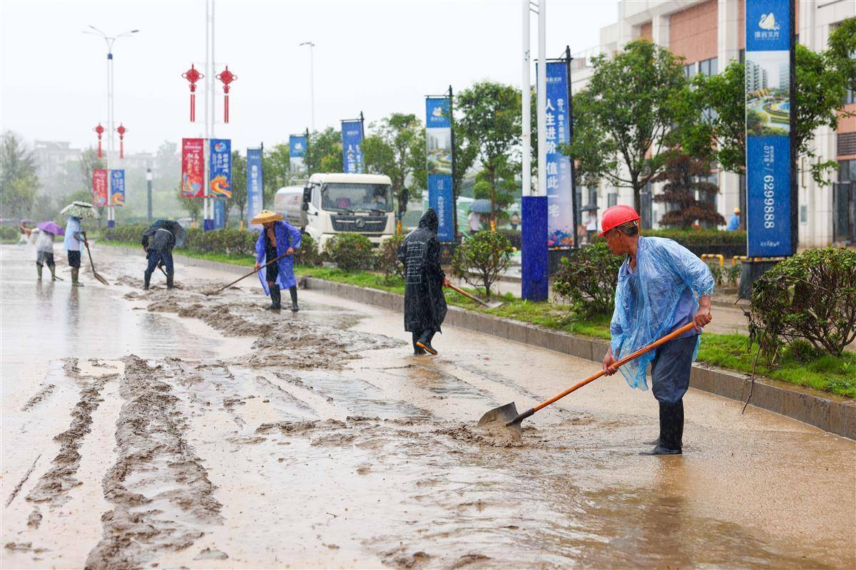 在农商城外武汉大道4期等地段,40多名环卫工人冒雨作业,奋力清除街道上厚厚的淤泥。“洪水退去后,我们连夜对洪水淹没的主要街道进行清淤,确保车辆通行。”现场负责人周新辉介绍。