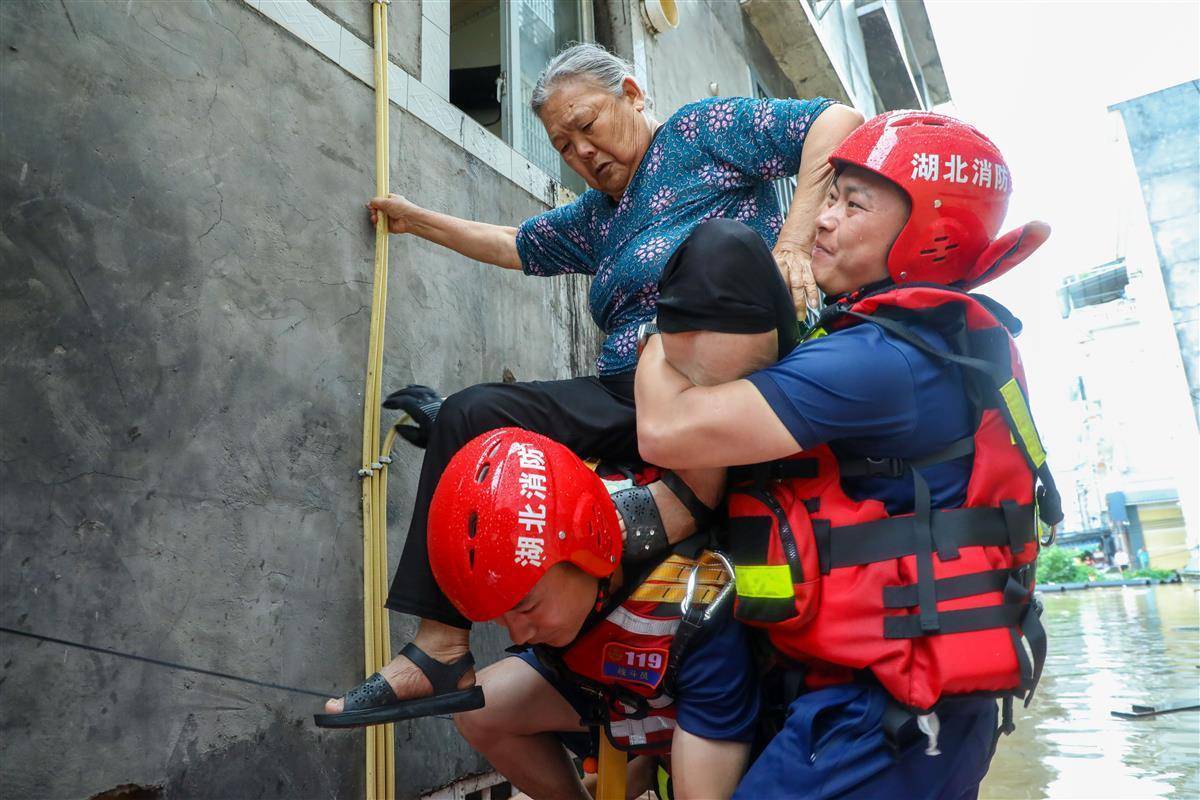 6月19日,在来凤县翔凤镇民族路,消防救援人员转移被困群众。(恩施消防供图)